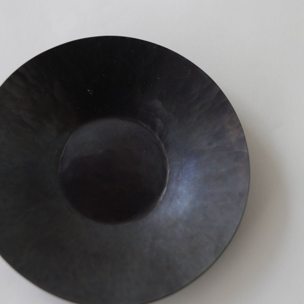 銅に硫化着色を施こされた茶托。時を経た銅の色味のよう。