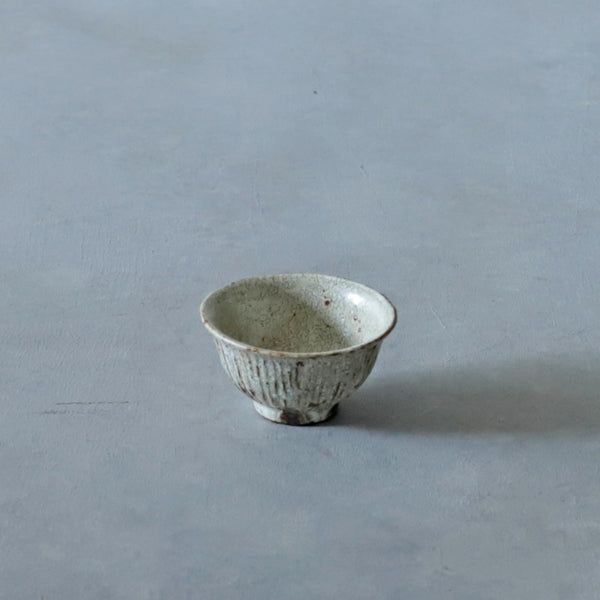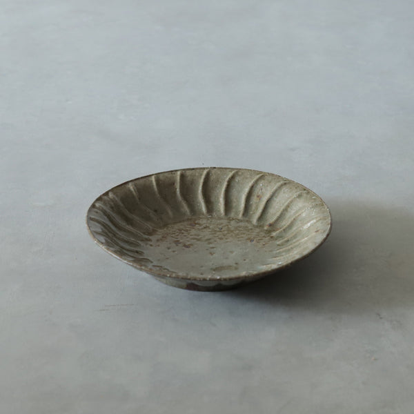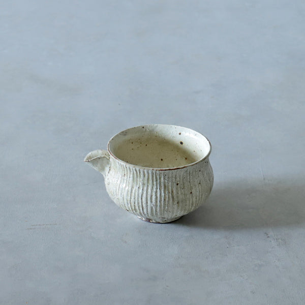 水飴のような透明感のあるとろりとした釉と細かく刻まれたしのぎ模様が交錯するガラス釉