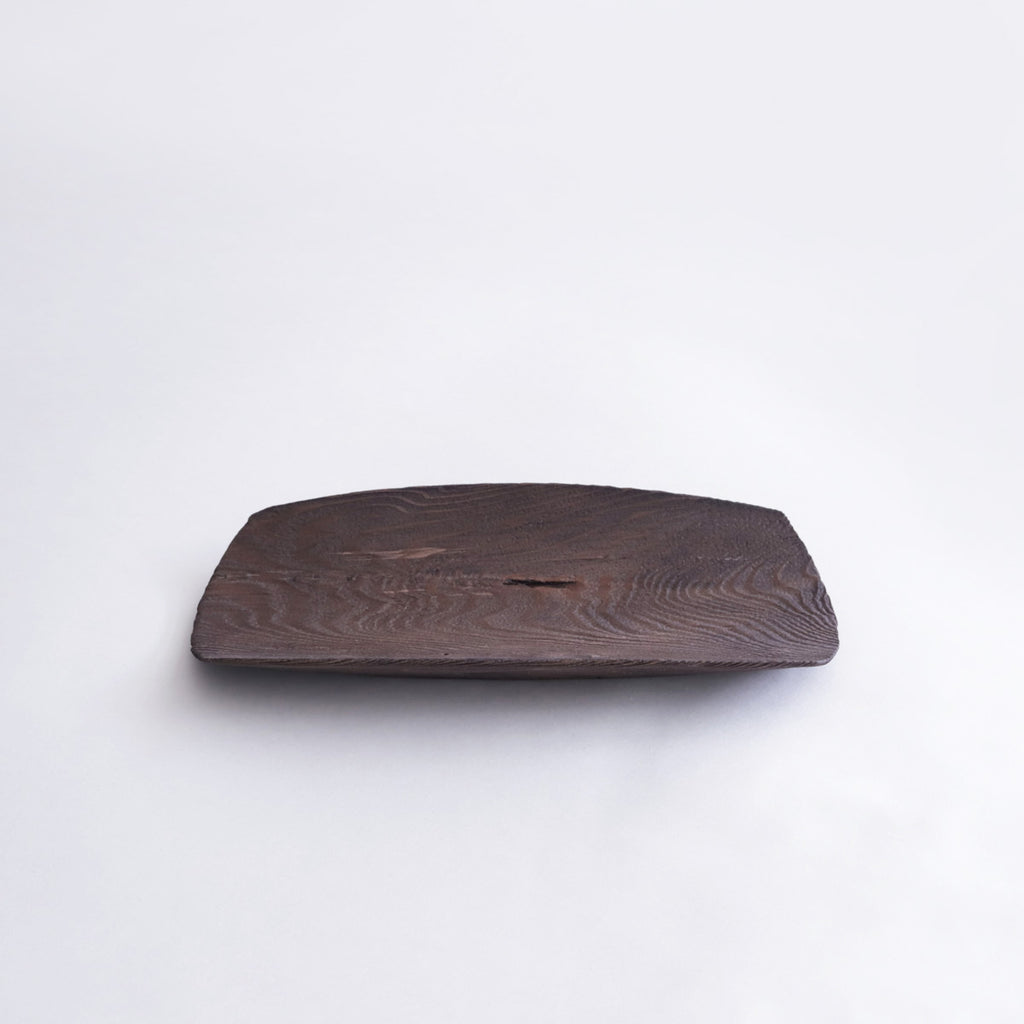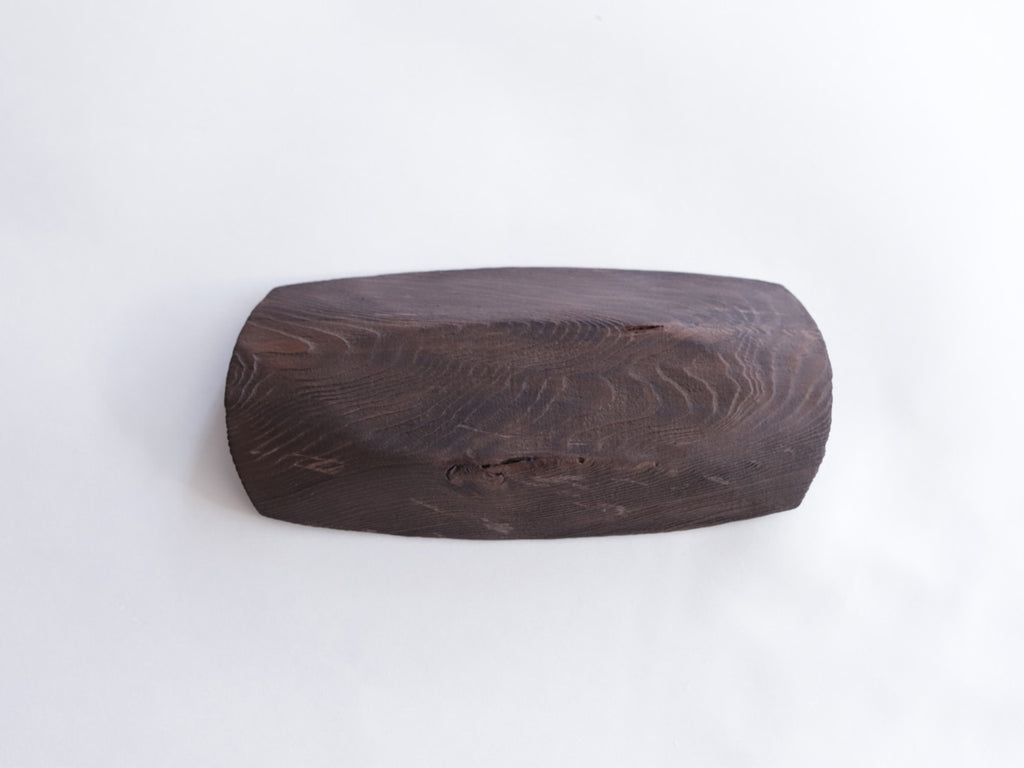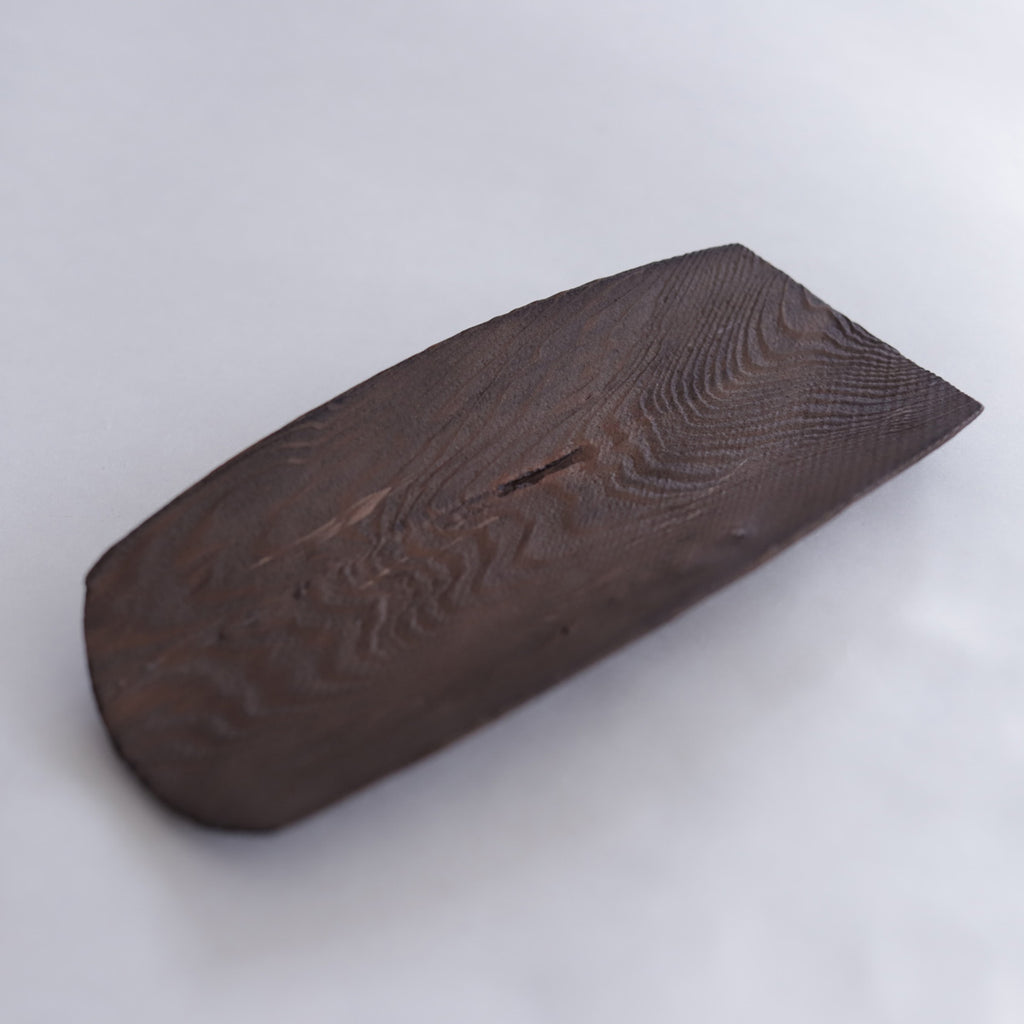 こちらは、細かな糸目の彫りあとと、イチイのきめ細かな木目が織りなす複雑な表情が楽しめる茶則。煮出した栗渋で染色しており、独特の鄙びた質感も魅力です。