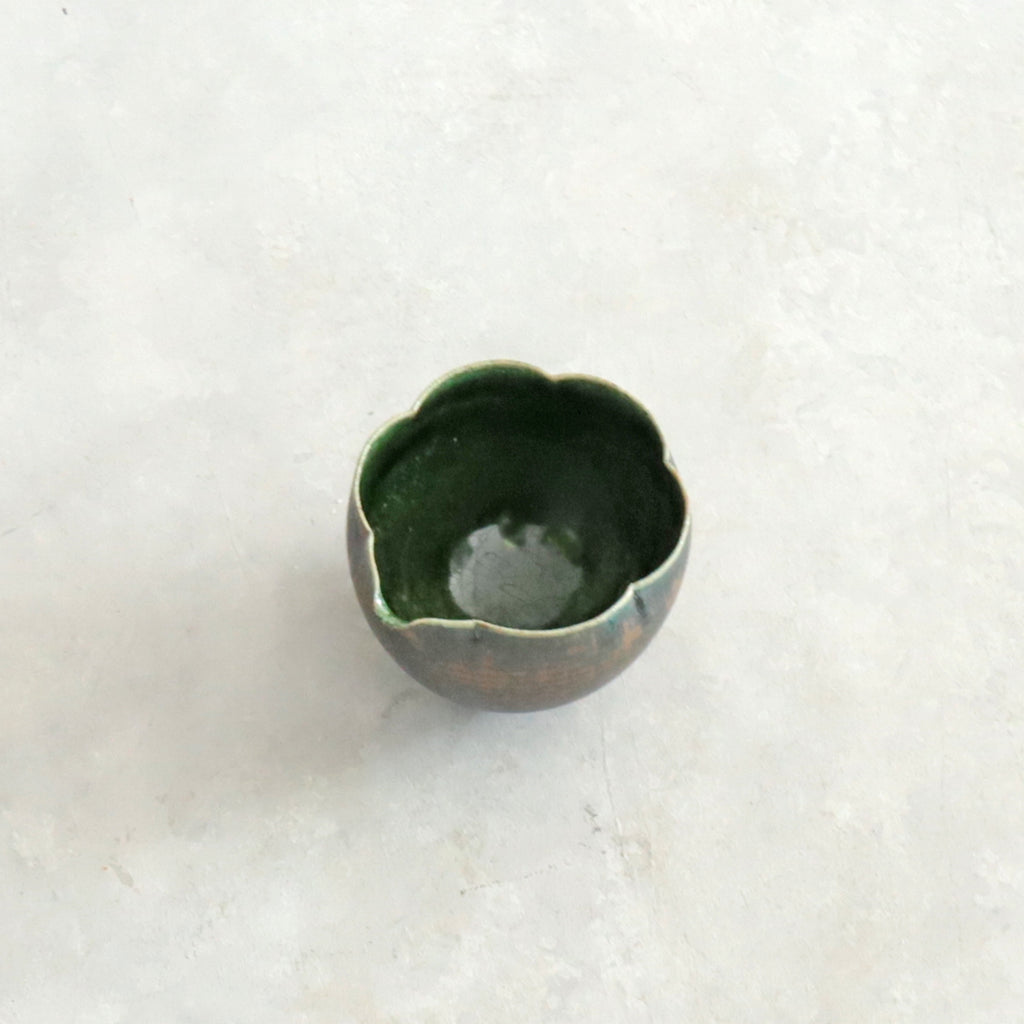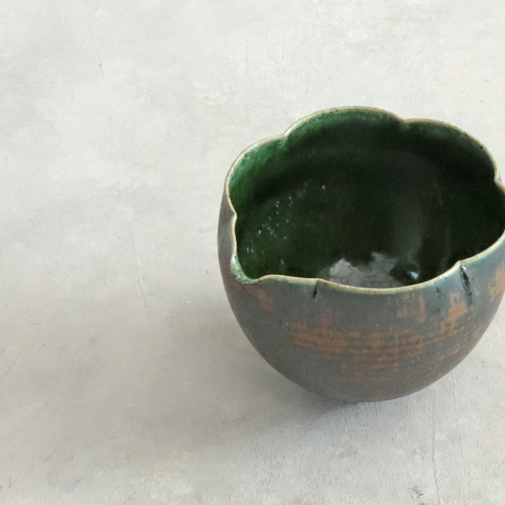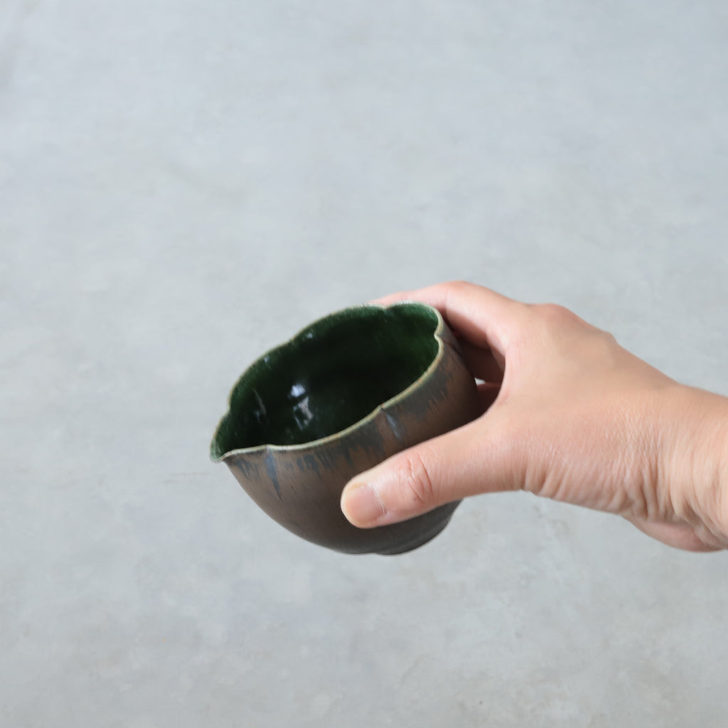 艶やかな織部の緑が美しい片口。外側のみ掛けられた黒釉は、うつわの印象を引き締めるとともに、独特の趣き深い表情をつくりだしています。