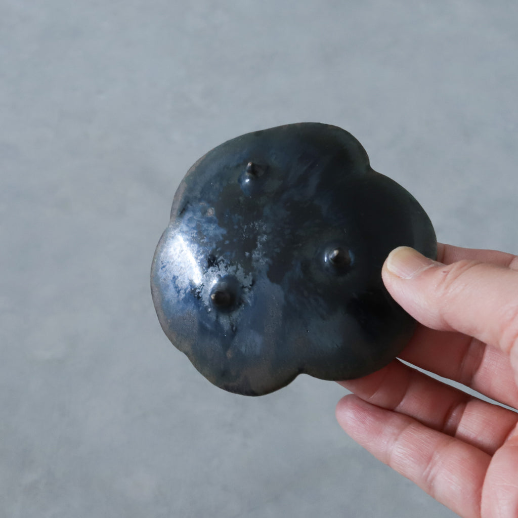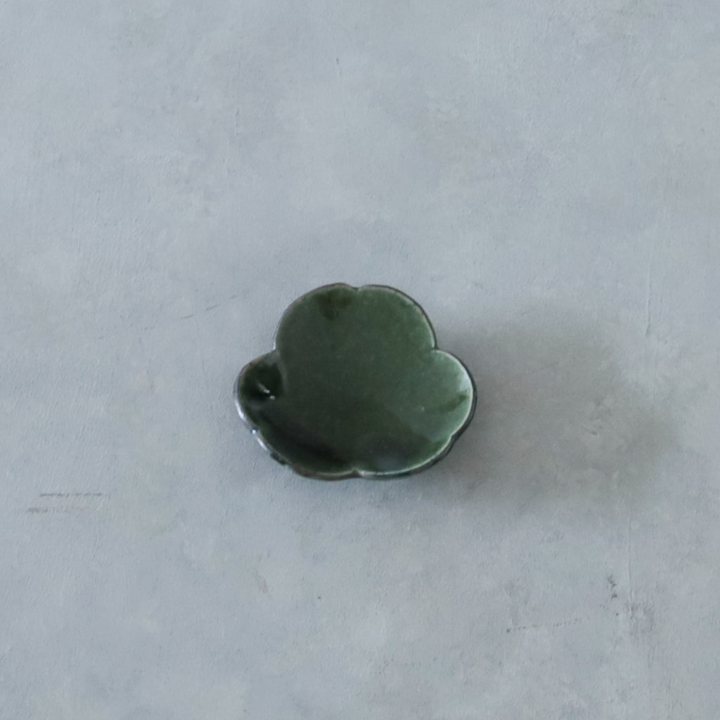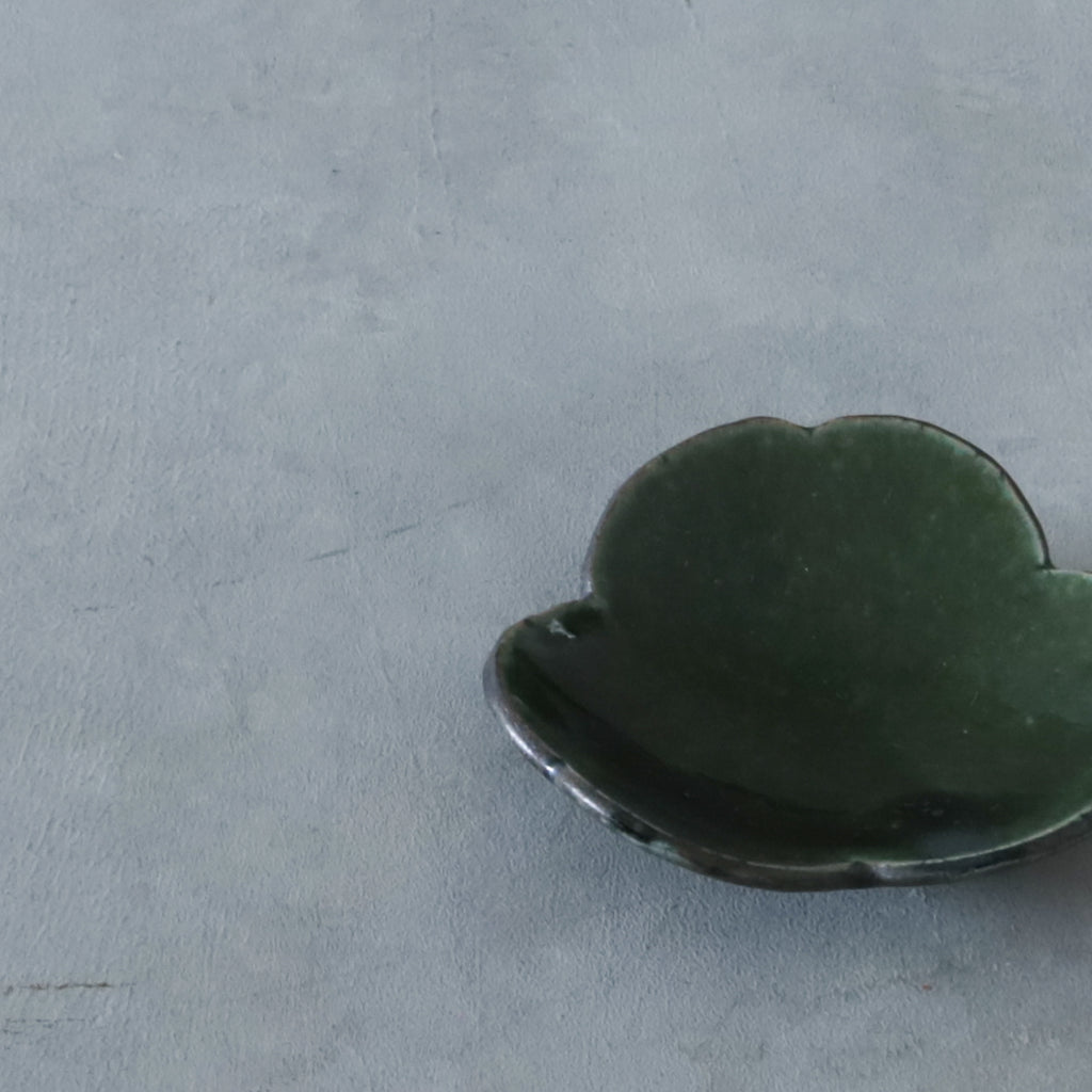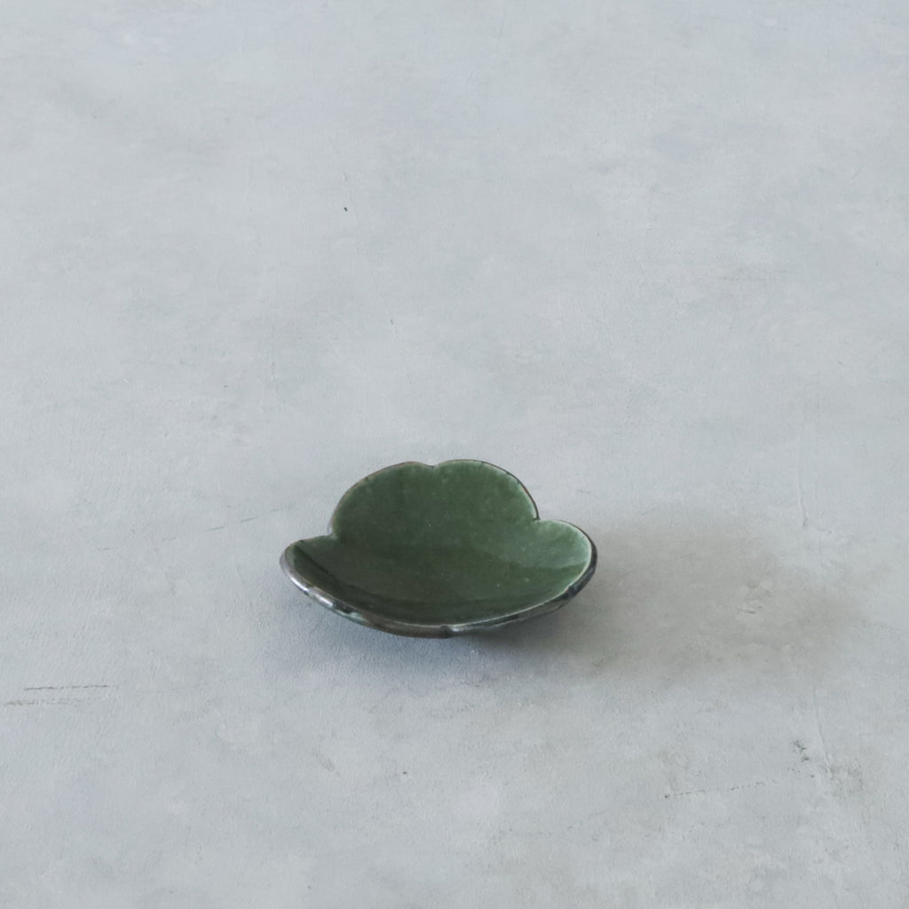 艶やかな織部の緑が美しい三つ葉型の小さなお皿。