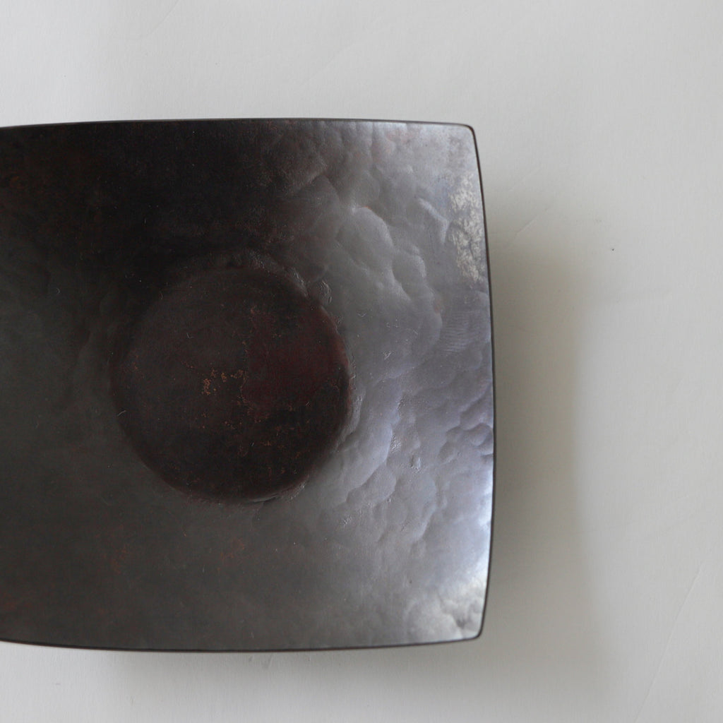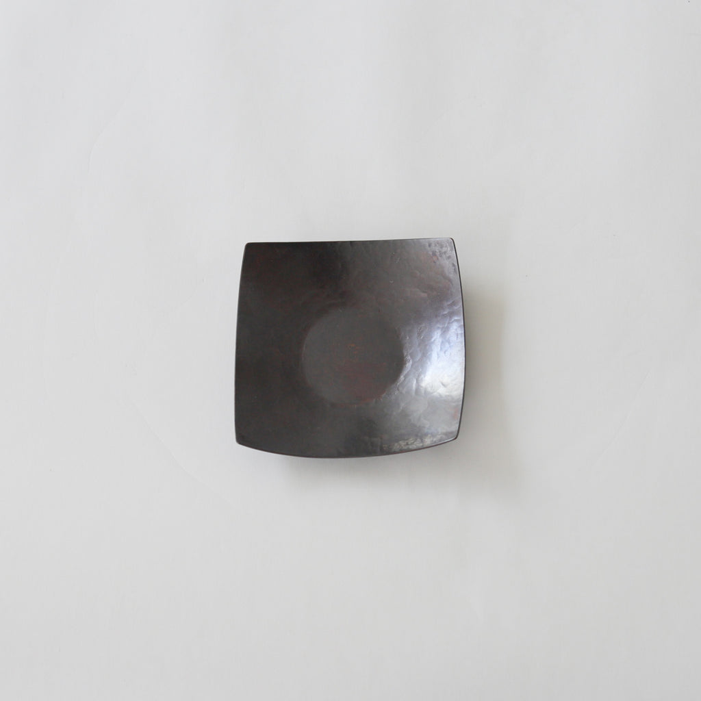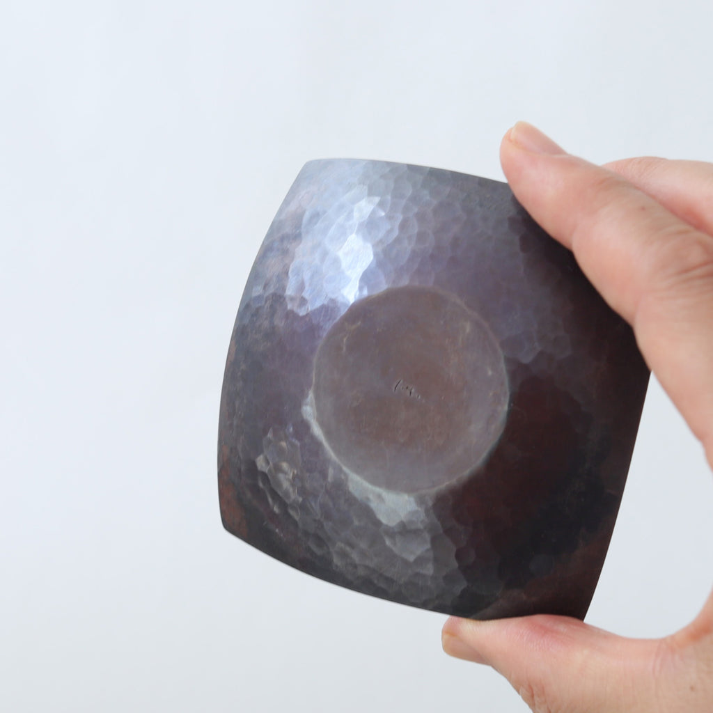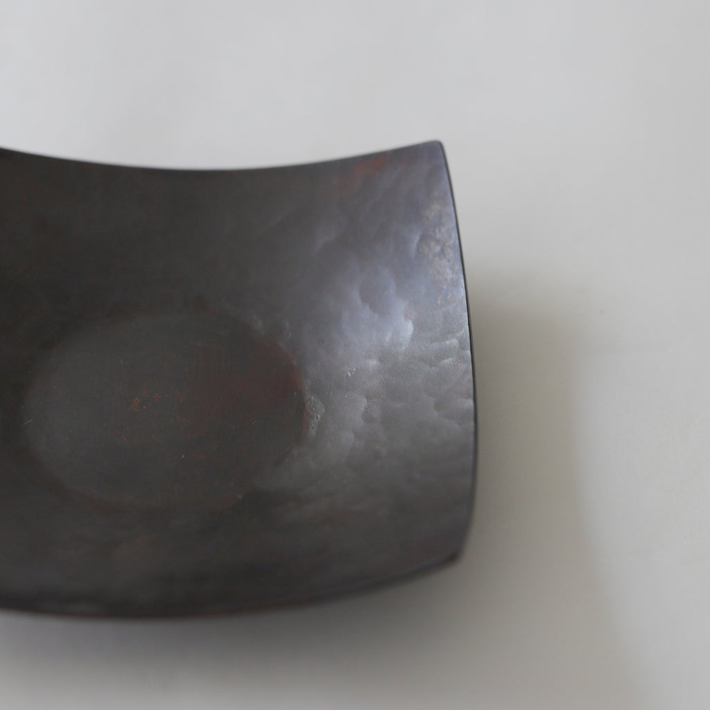 銅に硫化着色を施こされた茶托。時を経た銅の色味のよう。
