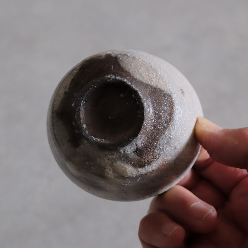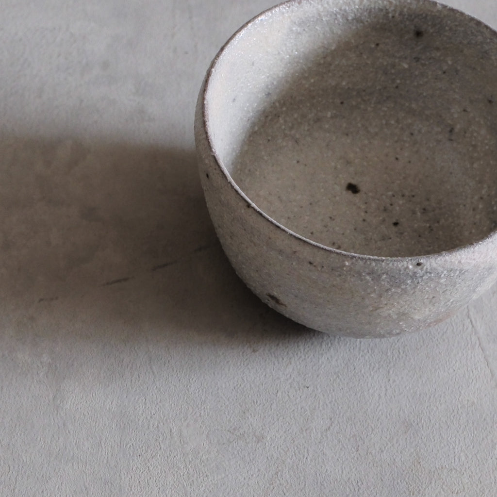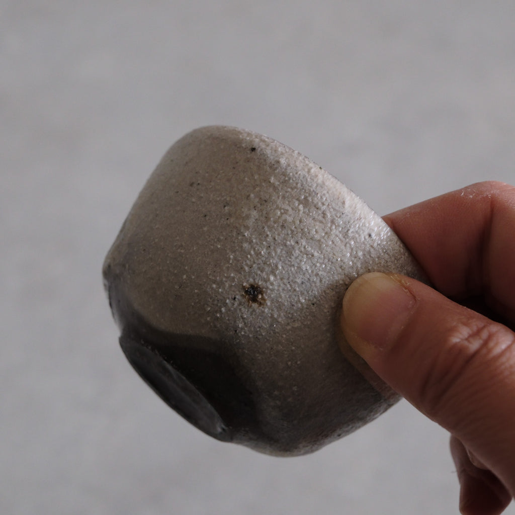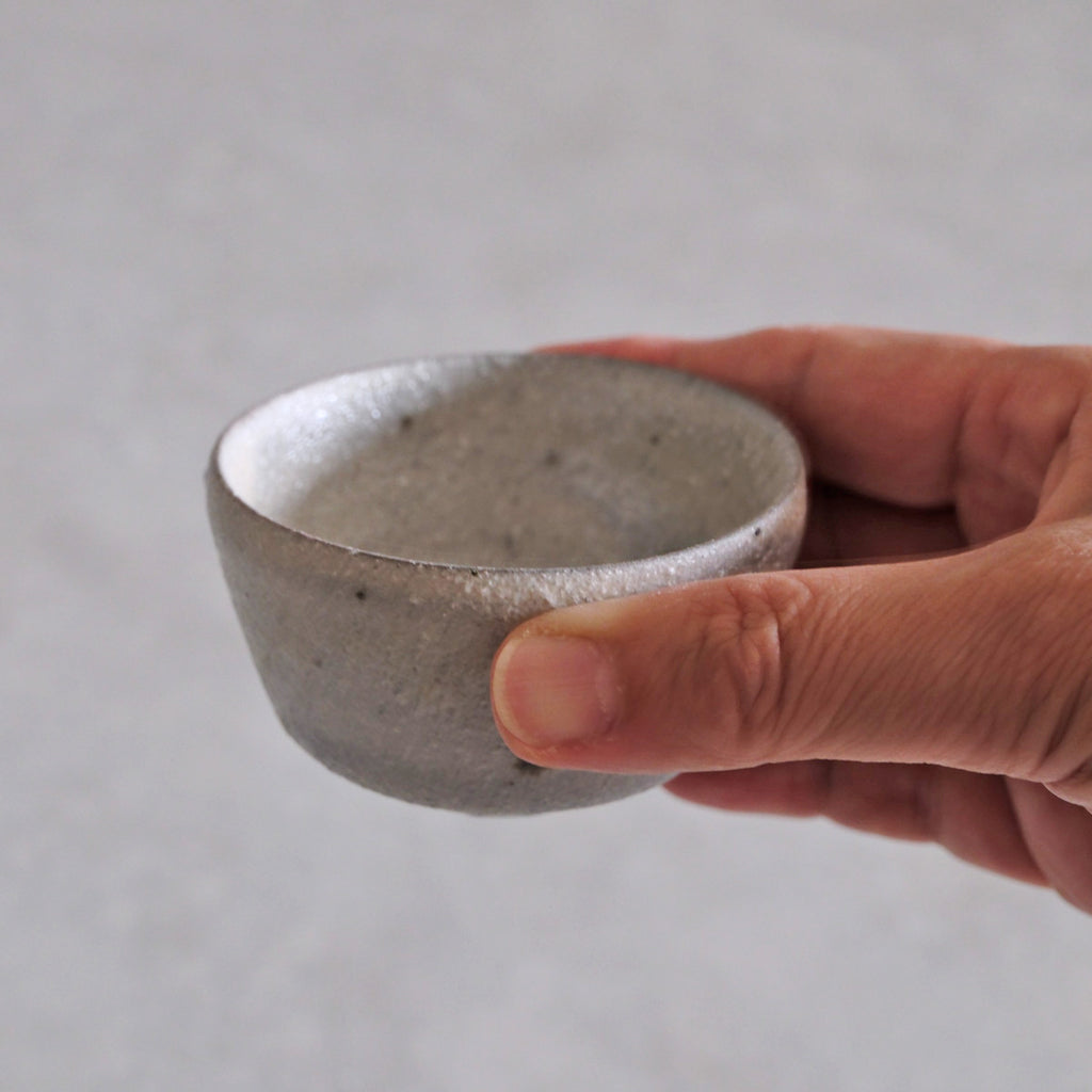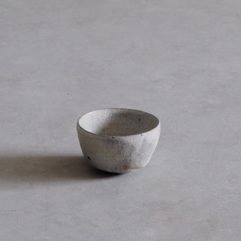 グレーがかった上品な白と淡い変化が印象的な粉引のぐいのみ