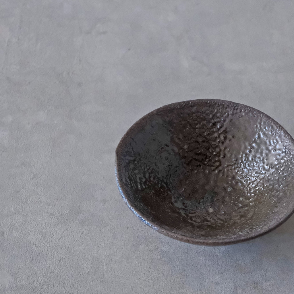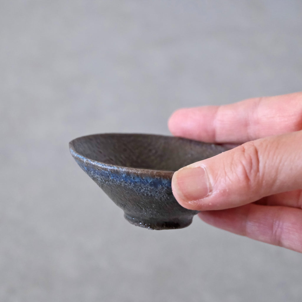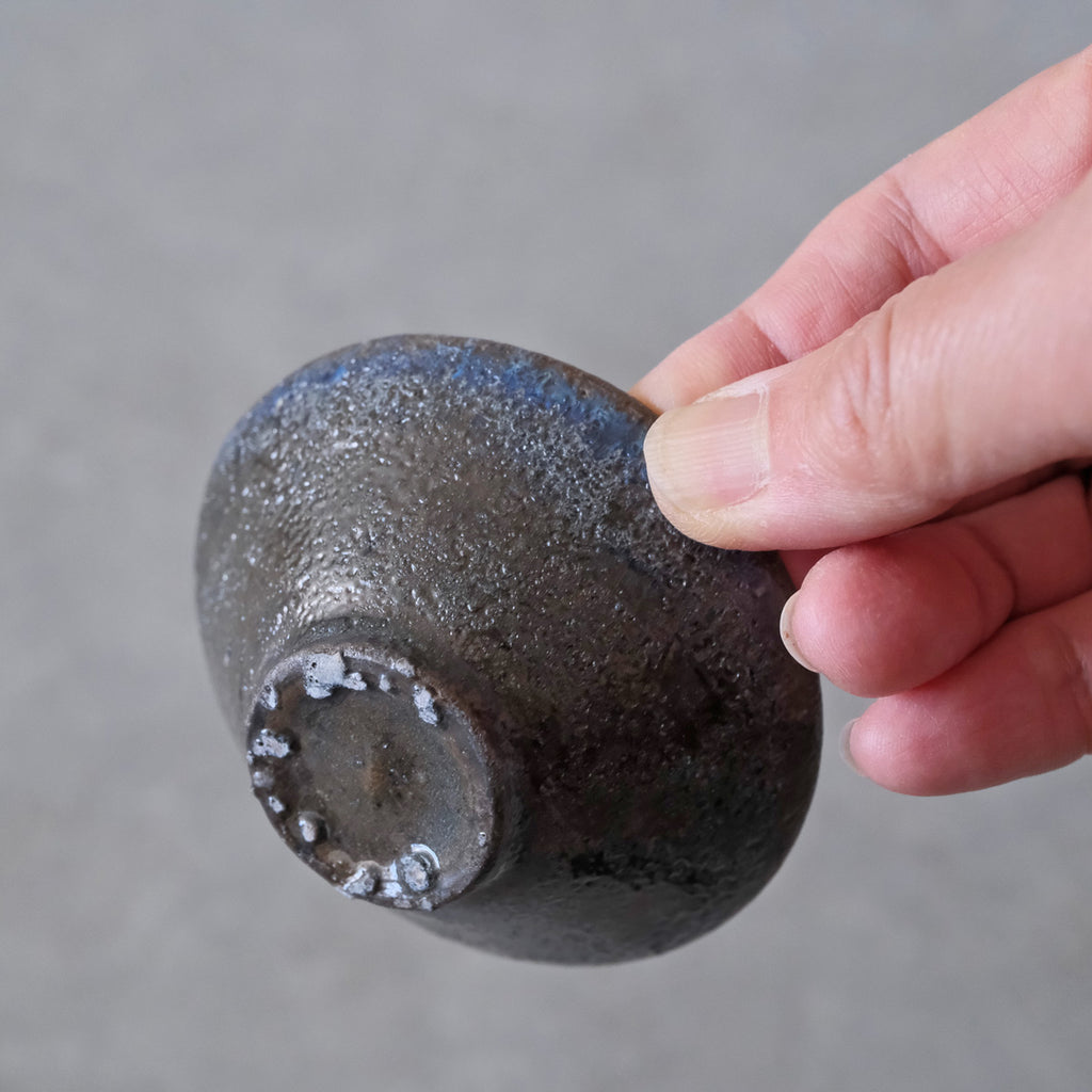 青磁と同じ釉をかけて穴窯で焼成した深みある色合いのぐいのみ。