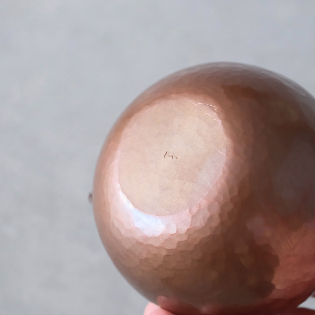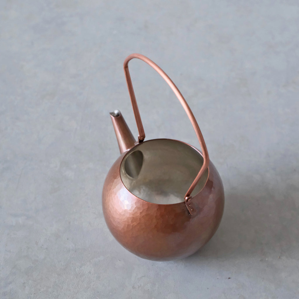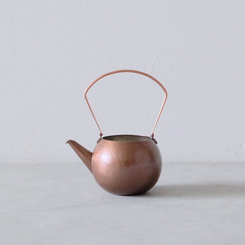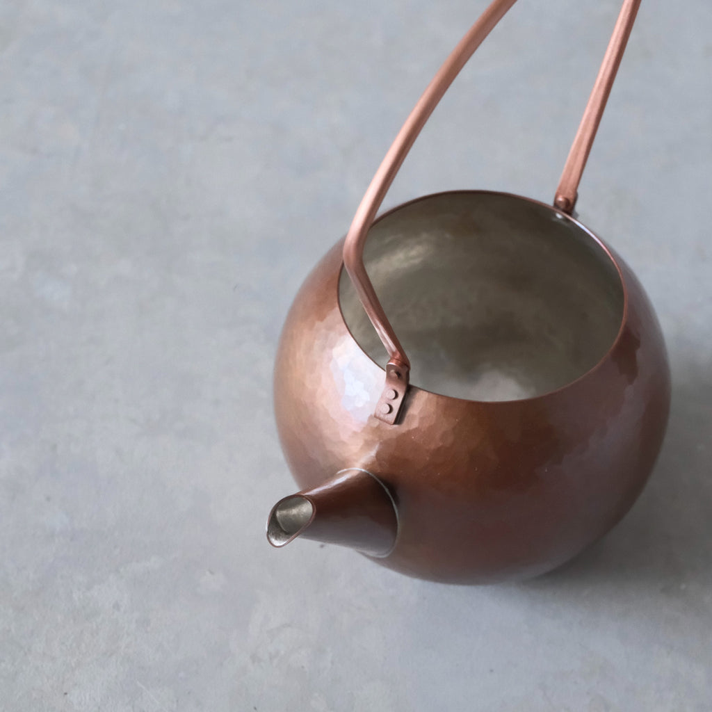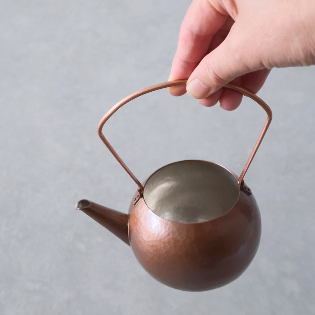 銅に硫化着色を施こされた注器。少し時を経た銅の色味のよう。