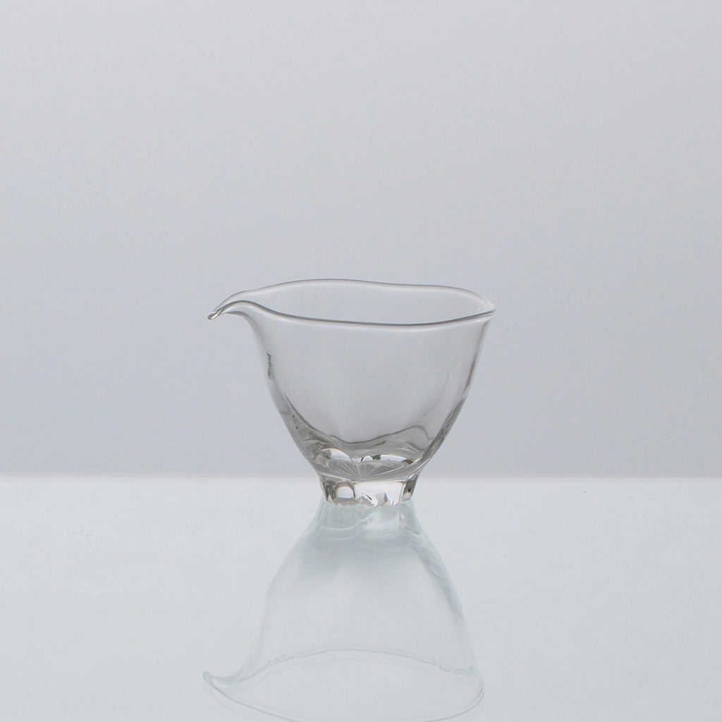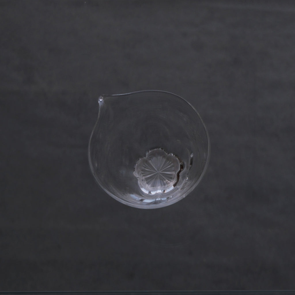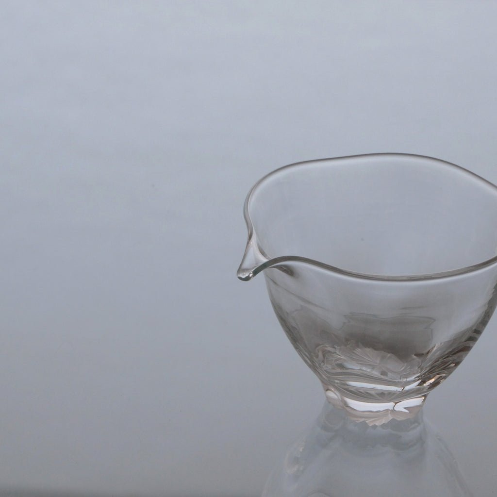 開きかけた花のような形と底に彫られた花形の削り模様が印象的な茶海。
