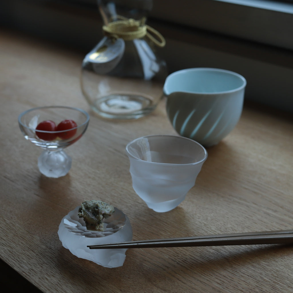 紋様の違いはもちろん、厚みの違い、紋様が施された側、透明硝子越し、それぞれ印象が異なります。