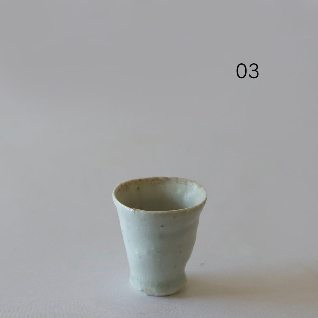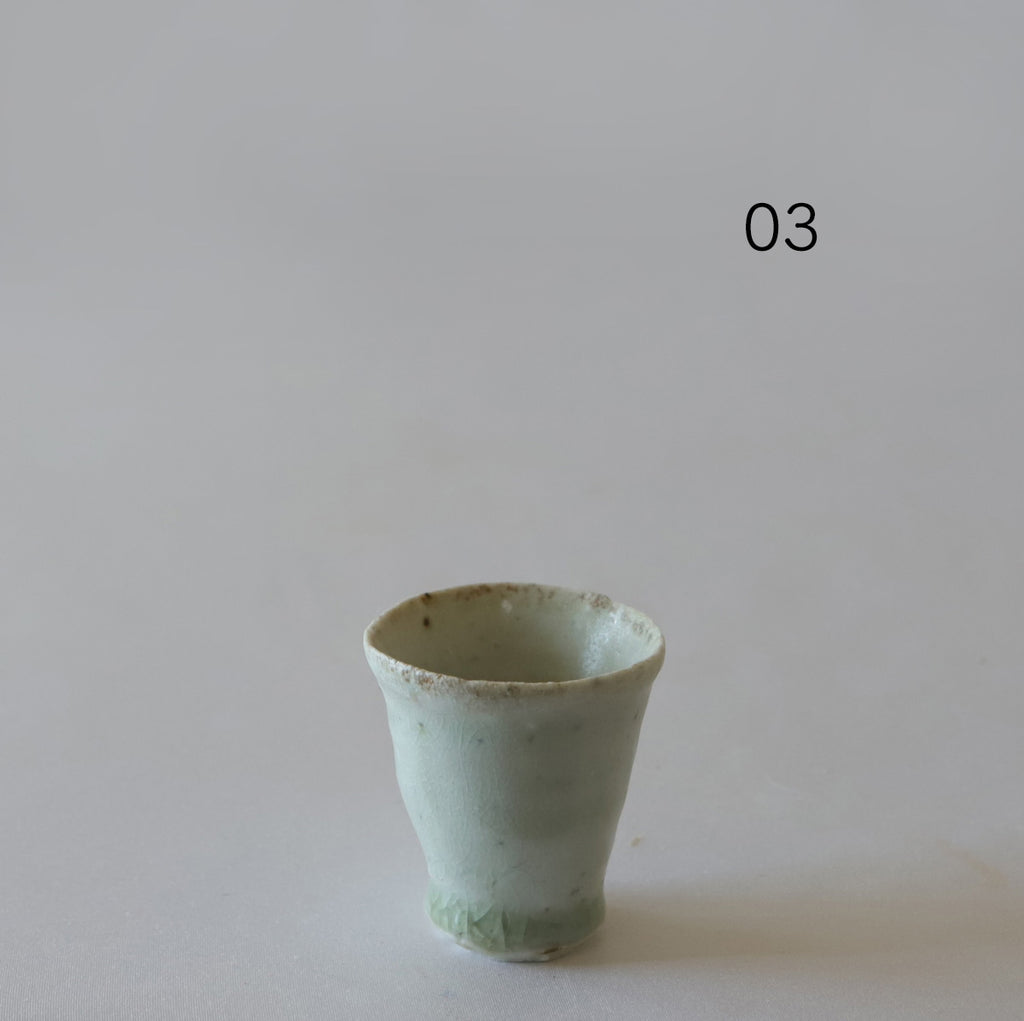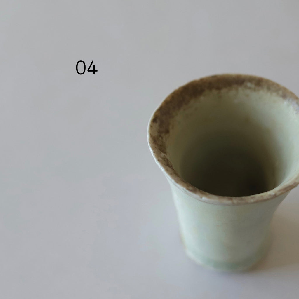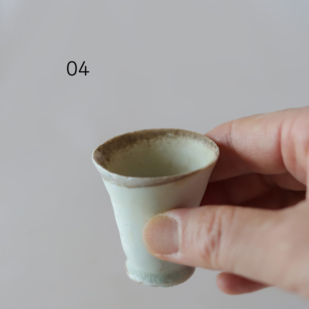 磁器土に化粧土を重ね、灰釉を掛けて薪窯で焼成された杯。