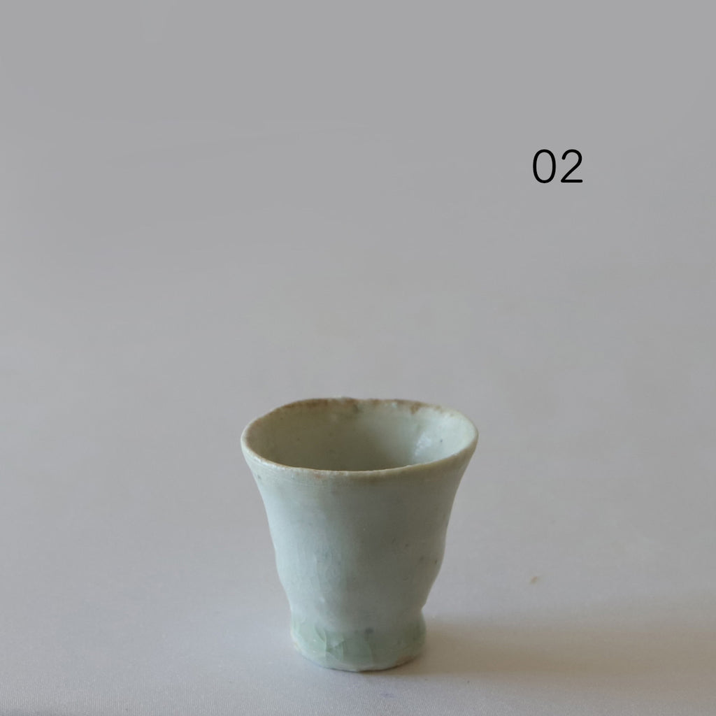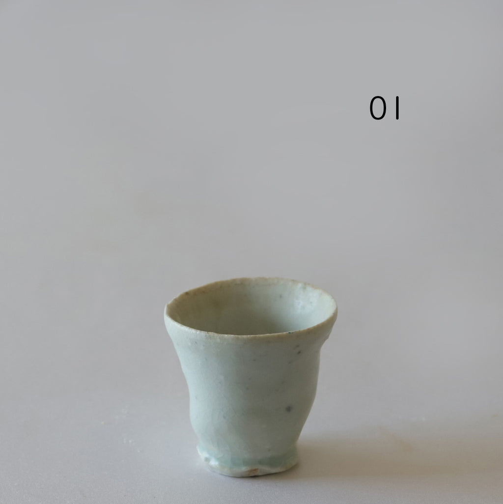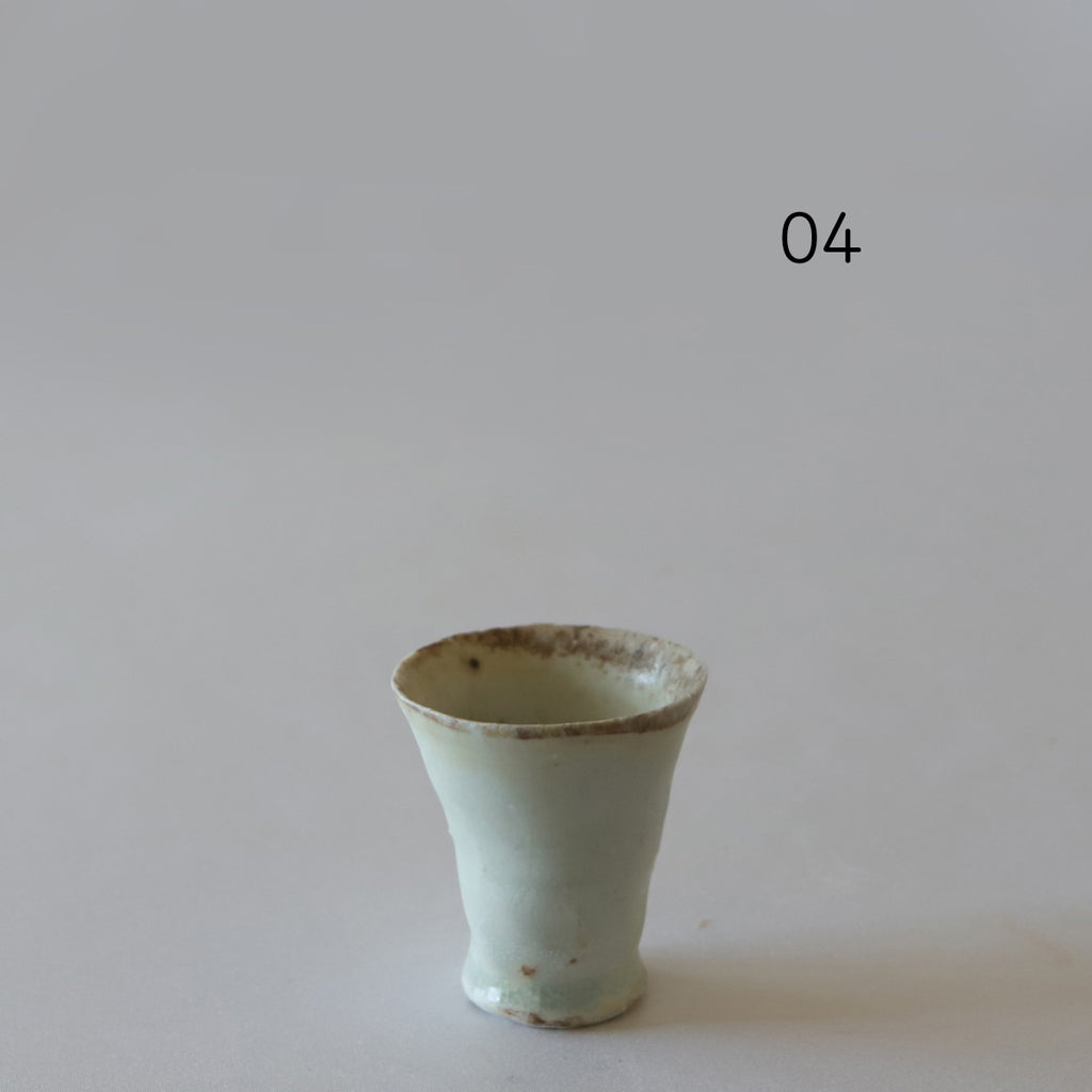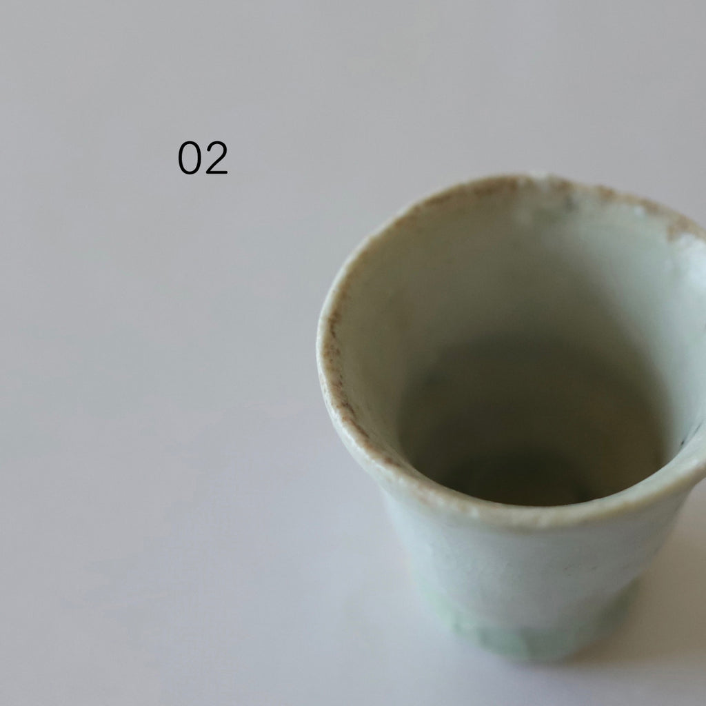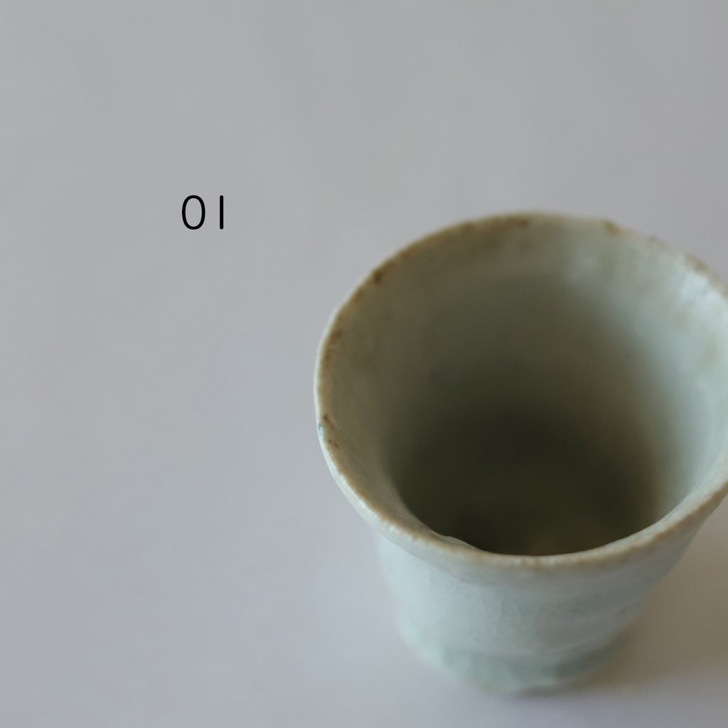 磁器土に化粧土を重ね、灰釉を掛けて薪窯で焼成された杯。