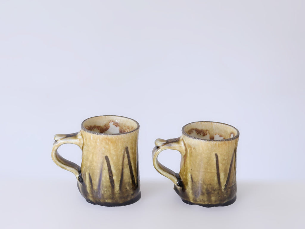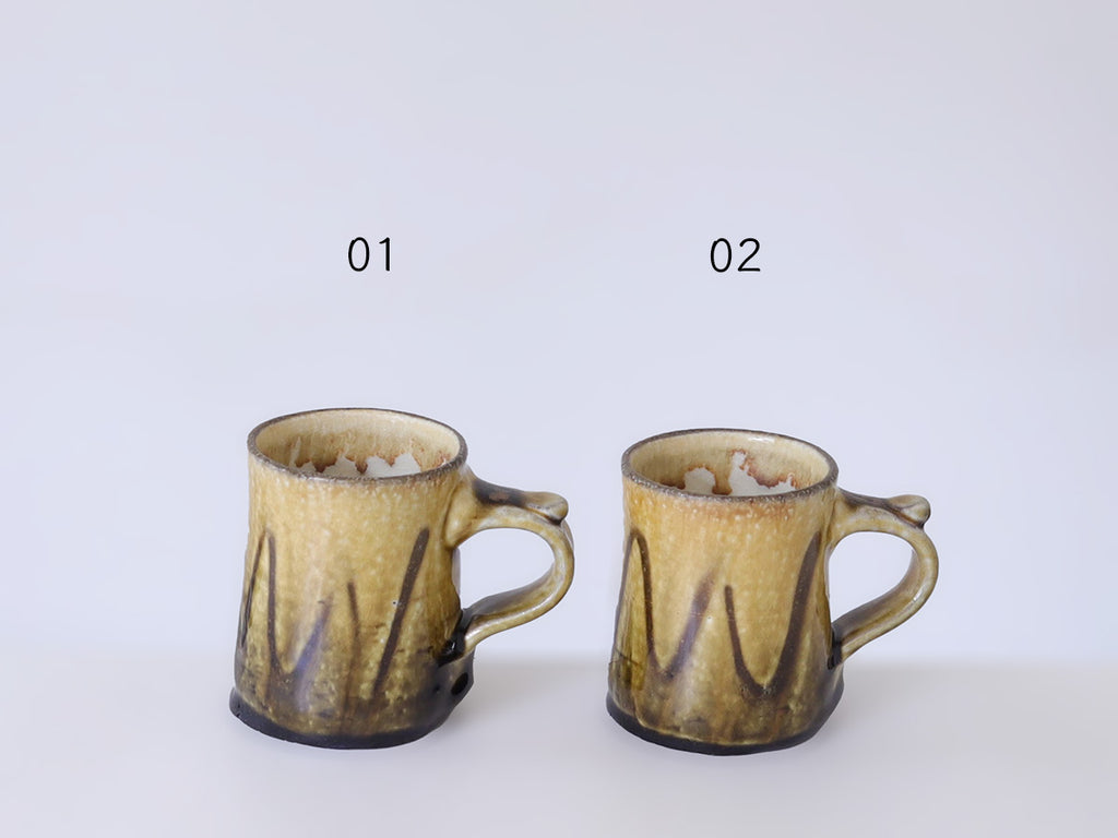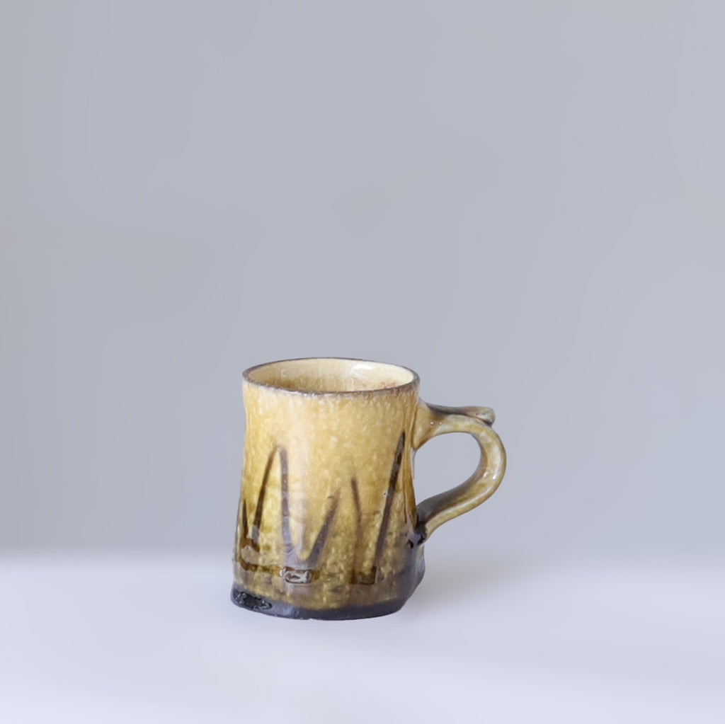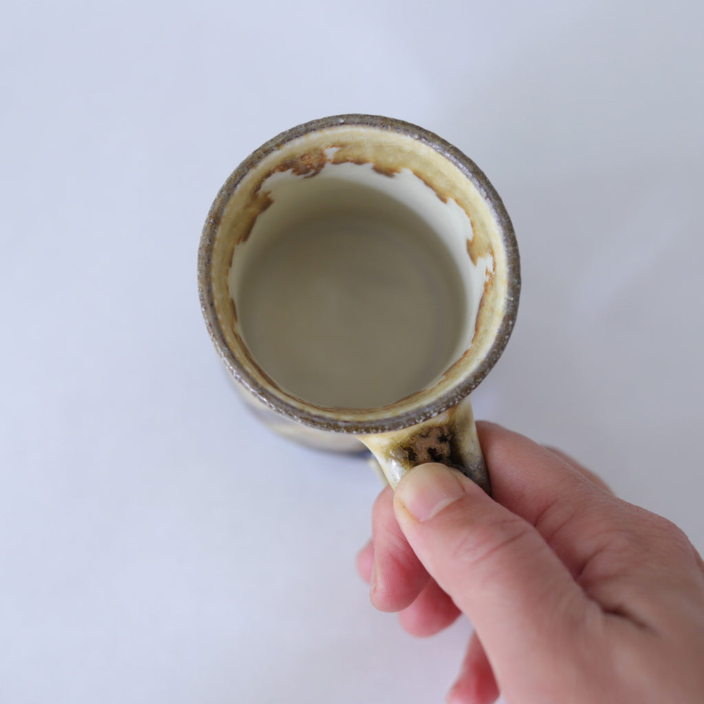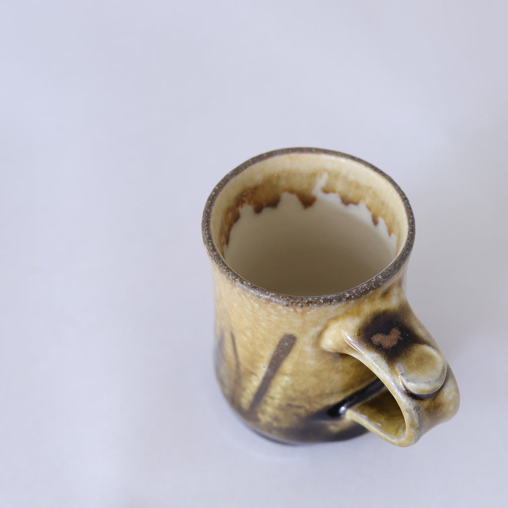 ぽってりとベッコウ色のアメ釉のかかった懐かしい趣のマグカップ。